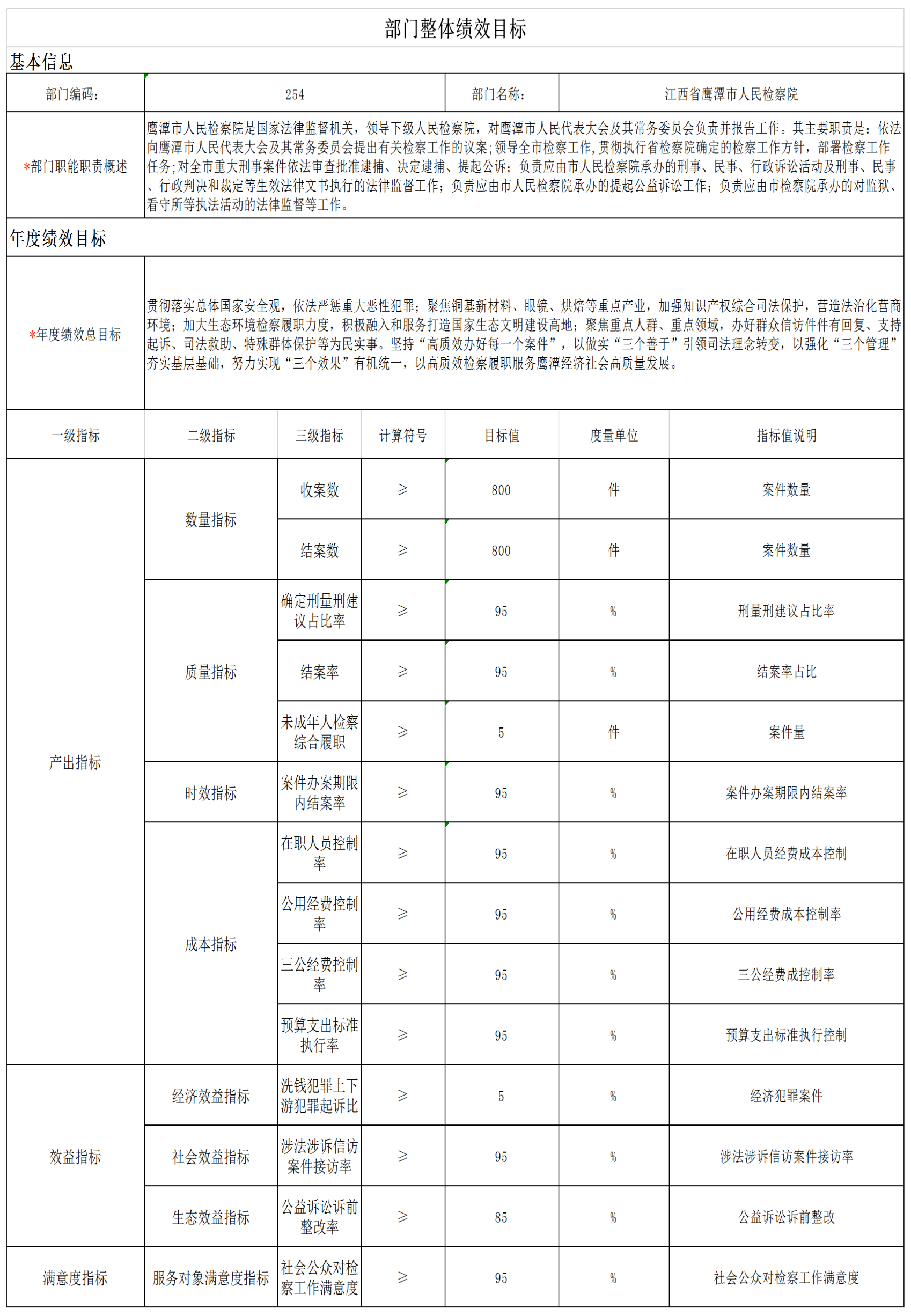 6.绩效目标:数量指标是各类案件办案率达标,质量指标是再审检察建议采纳率达标,成本指标是公诉、刑事、民事、行政等案件办理成本,时效指标是办案期内案件完结率,社会效益指标是提升检察办案工作能力,满意度指标是公众对检察院工作满意度。