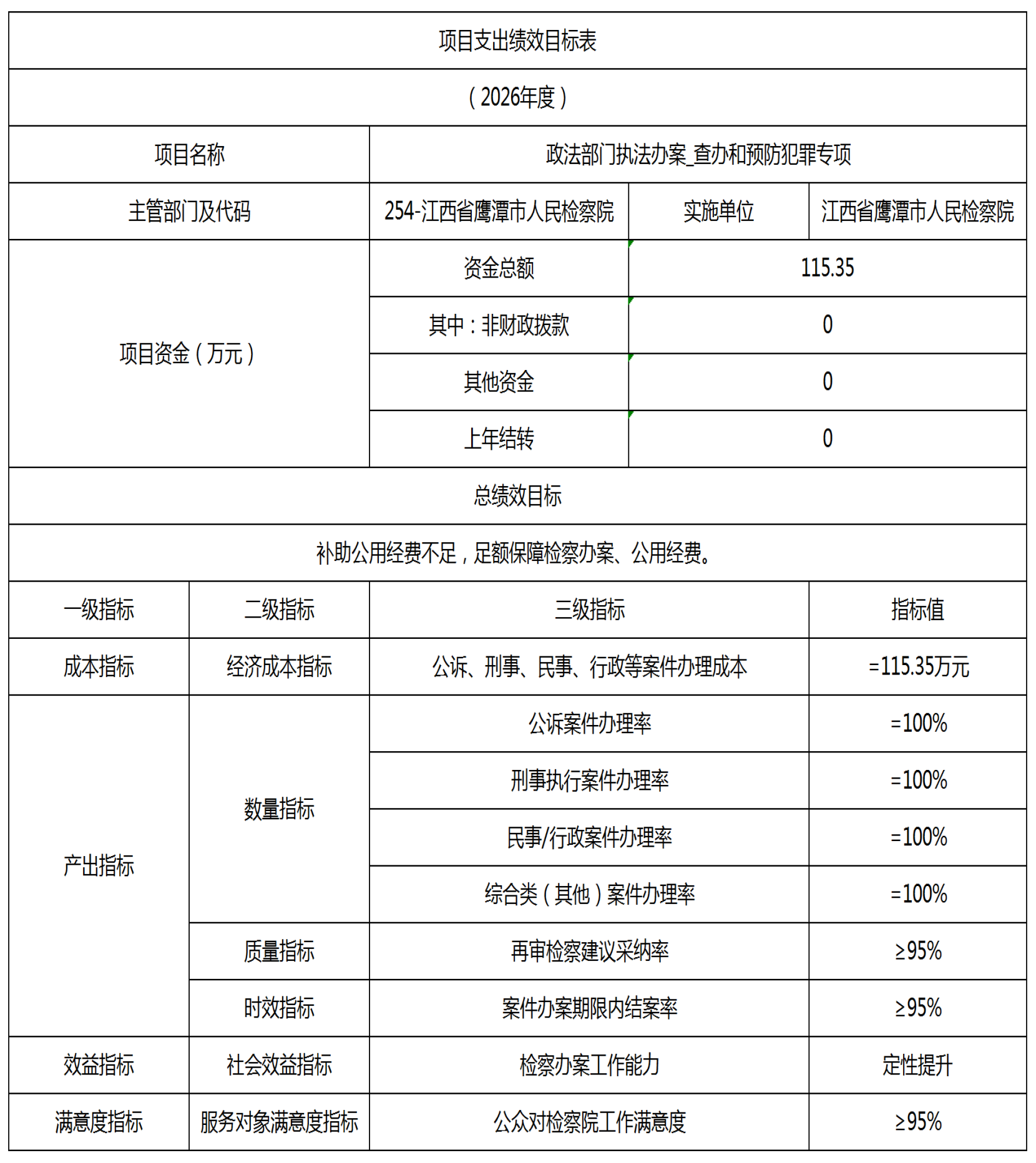 1.项目概述:查办和预防犯罪专项是办案业务经费,以遏制犯罪高发态势、铲除犯罪滋生土壤为核心目标,聚焦电信网络诈骗、涉黑涉恶、职务犯罪等,整合执法司法、行业监管、社会治理等多方力量,构建“查办打击—分析研判—预警预防—长效治理”的全链条工作体系,实现“打防管控一体化推进”,切实维护鹰潭治安秩序稳定,提升公众安全感和法治获得感。