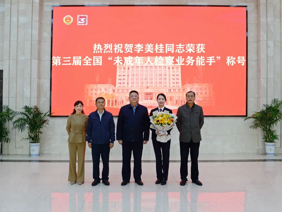 4月23日,鹰潭市检察院举行欢迎仪式,庆祝“全国未成年人检察业务能手”李美桂同志载誉归来。市院党组书记、检察长张江出席仪式。市院党组成员、政治部主任刘秋有,市院党组成员、副检察长廖峰及相关部门负责同志参加。