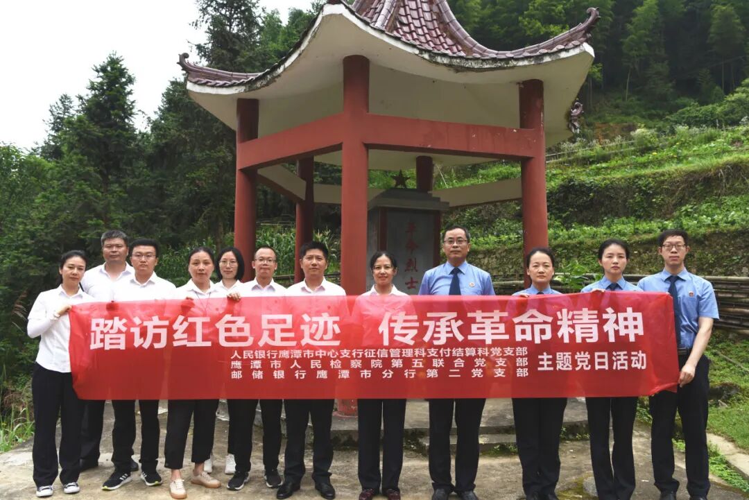 为深入学习贯彻党的二十大精神,促进新时代机关党建和检察业务深度融合,更好将党建优势转化为检察工作发展优势,6月14日,中共鹰潭市人民检察院第五联合党支部会同中共鹰潭市人民银行征信管理科支付结算科党支部、中共邮政储蓄银行鹰潭市分行第二党支部联合开展“踏访红色足迹 传承革命精神”主题党日活动。市院副检察长廖峰、市人行副行长金晓春以普通党员身份参加活动。