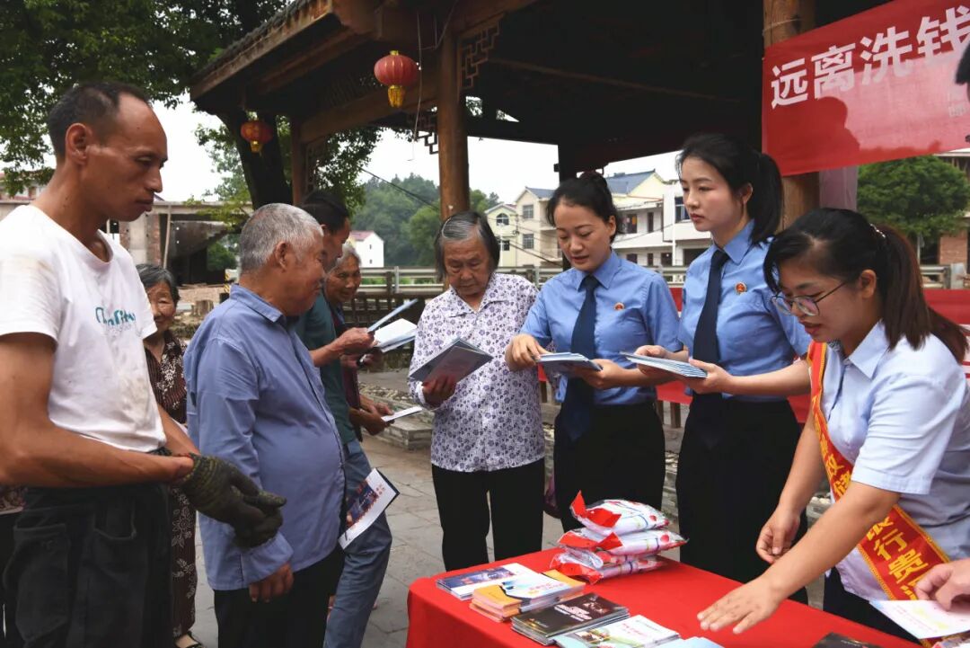离开闽坑村,同志们来到塘湾镇集镇开展“反电诈”“反洗钱”普法宣传。通过摆放宣传展板、发放宣传资料、现场答疑解惑等形式,向到场群众解读电信网络诈骗、洗钱等典型案例,介绍当前各类金融诈骗及常用手段,帮助群众熟悉反诈、反洗钱知识,并针对学生、老人、商铺经营者等重点人群分类讲述防范措施和应对技巧,提高群众防范化解经济金融风险的意识和能力。