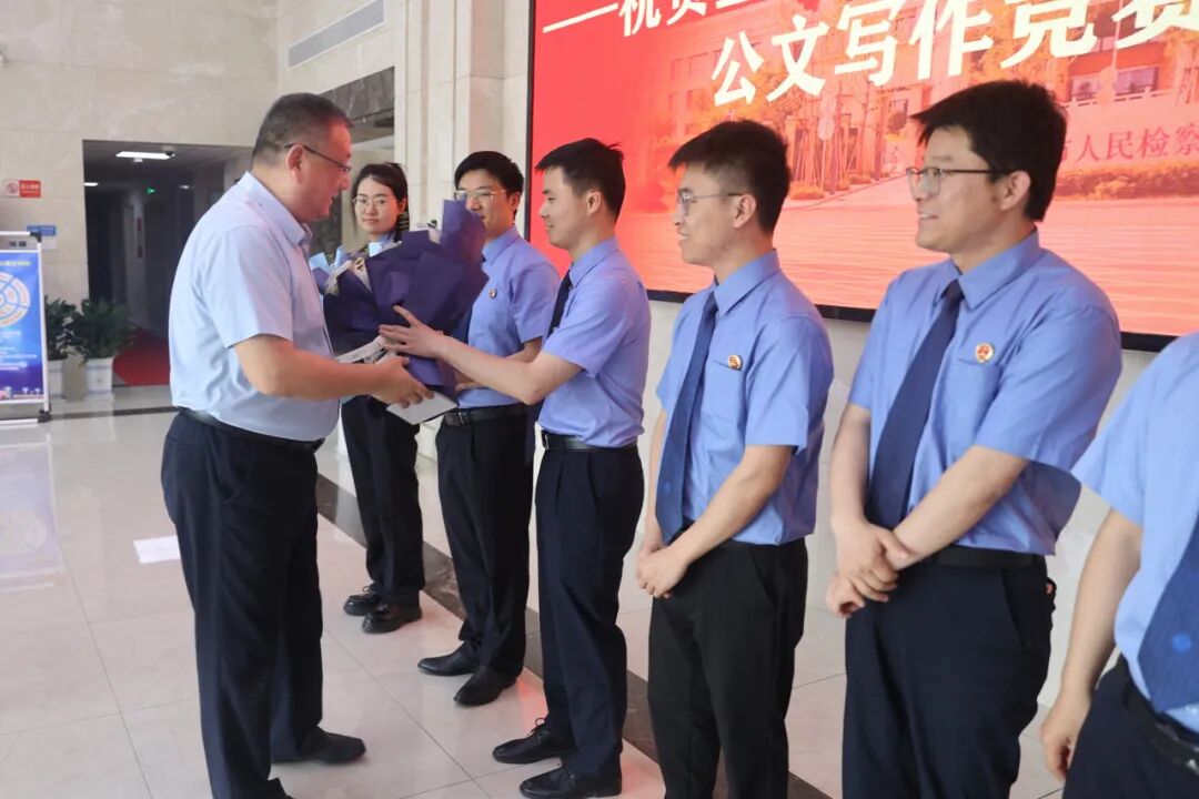 市检察院党组书记、检察长张江为每一位努力拼搏、载誉而归的同志送上鲜花,祝贺他们取得优异成绩,并嘱咐他们以本次竞赛获奖为契机,进一步继承和发扬五四精神,树理想、敢担当、能吃苦、肯奋斗,在检察业务、综合行政等各方面工作中勇当排头兵和生力军,努力展现自信自强、刚健有为的青春风貌。