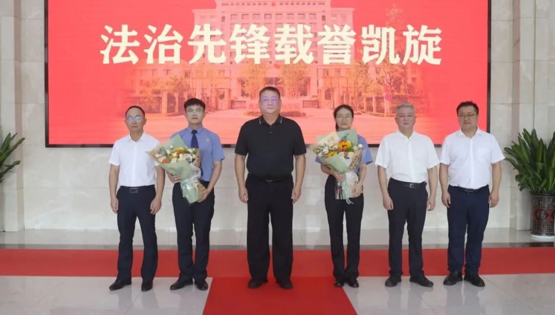 7月11日,鹰潭市人民检察院党组书记、检察长张江为获奖的两名干警献上鲜花,充分肯定他们为鹰潭检察努力拼搏争得荣誉,并勉励他们继续加强理论学习,不断提升法律专业素养,推动宪法精神在全市特别是青少年群体中的深入普及。