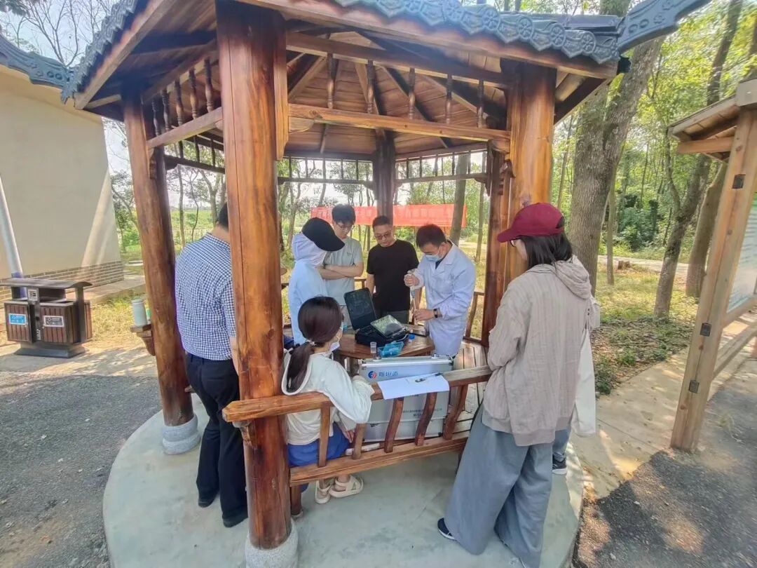图为学员们在排污设施现场取水样,并在老师指导下完成初步检测。