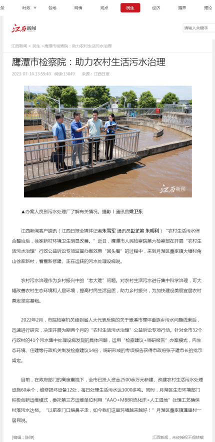 近日,鹰潭市人民检察院第六检察部开展“农村生活污水治理”行政公益诉讼专项监督办案效果“回头看”活动。农村污水治理作为乡村振兴中的“老大难”问题,对改善农村生态环境和人居环境相当重要。市院检察机关接到污水问题线索后,运用“检察建议+调研报告”办案模式,向生态环境、住建等行政机关制发检察建议14份。目前,全市已新建、改建农村生活污水处理设施60余个,维修损坏设备12处,每日处理生活污水达1000多吨。