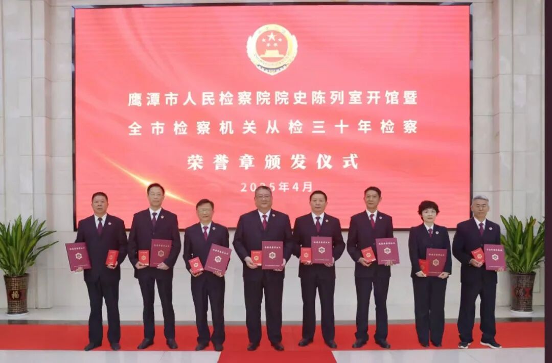 为增强检察职业荣誉感、使命感,进一步激发全市检察人员实干担当、争先创优的奋斗意识,4月17日,鹰潭市人民检察院举办全市检察机关从检三十年检察荣誉章颁发仪式。市检察院党组书记、检察长张江出席仪式,并为邹晓春、孙赵发等7名同志颁发了从检三十年检察荣誉章。市检察院党组副书记、副检察长张晓峰主持仪式。
